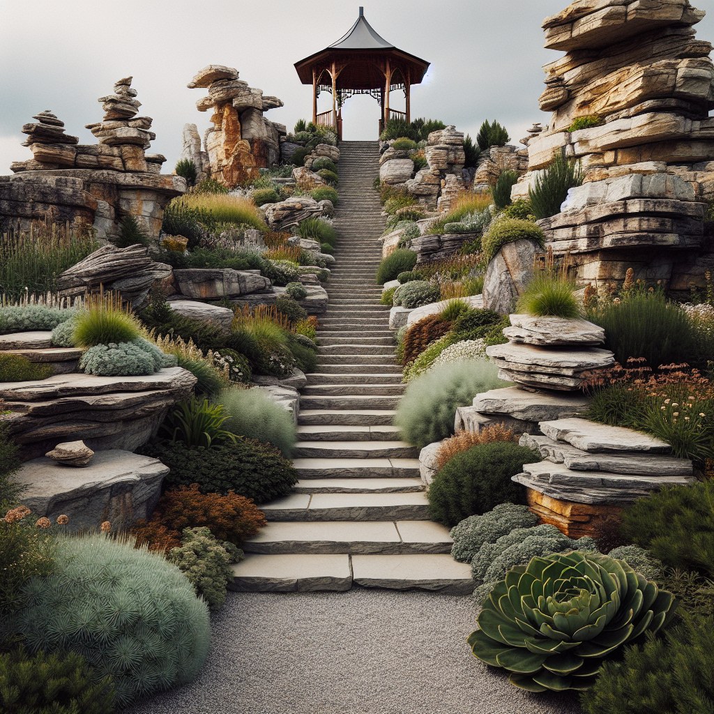 - Ступени из камня или плитки. Для преодоления крутых участков можно построить ступени из натурального камня или плитки. Это не только облегчит передвижение по участку, но и добавит оригинальности вашему ландшафту. На нижней части склона можно расположить ручей, который создаст атмосферу спокойствия. Альпийские горки своими руками на склоне низины — это не только прекрасно, но и практично.