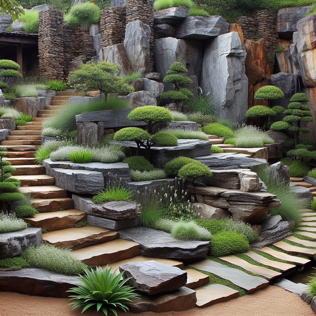 - Использование камней и других материалов. Камни могут стать отличным декоративным элементом на наклонной местности, а также помочь в укреплении скатов, расположив их выше. Можно взять различные виды камней, кирпича или бетона для дорожек, ступенек и подпорных стен.