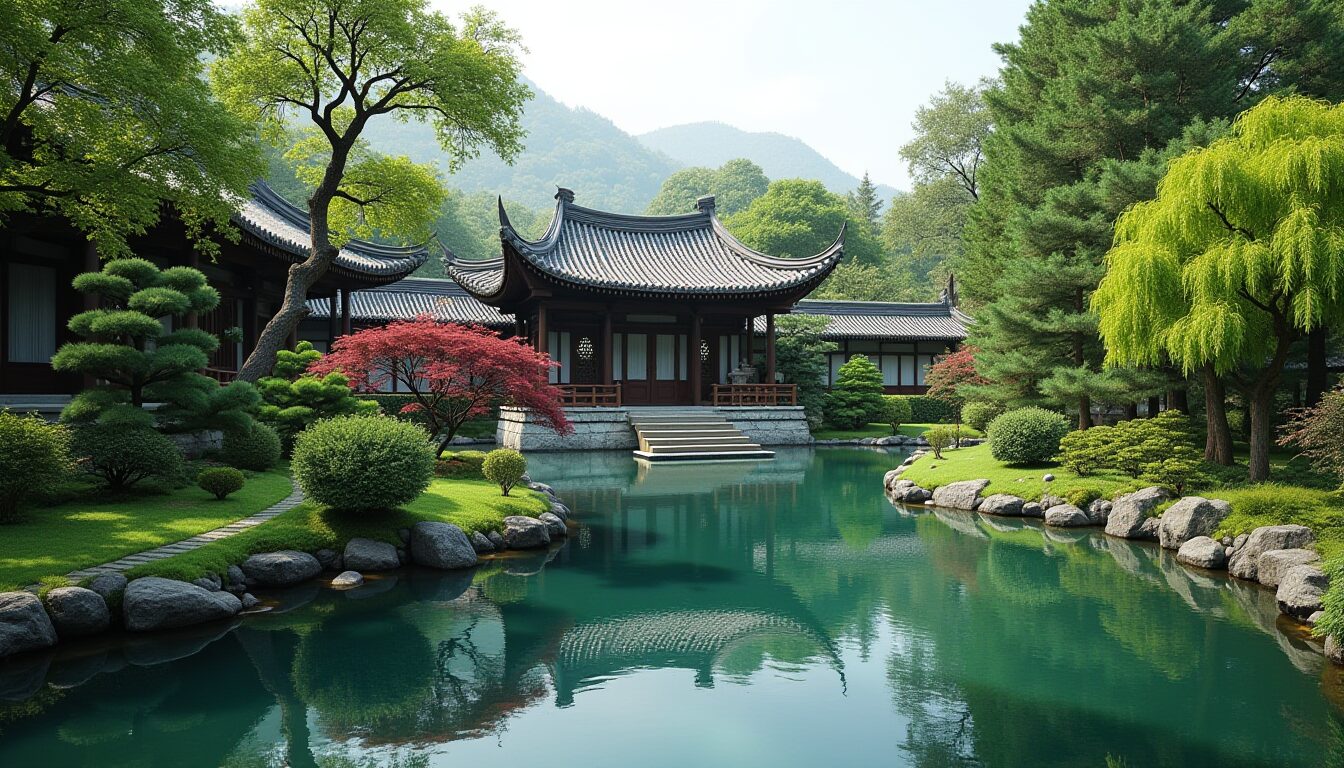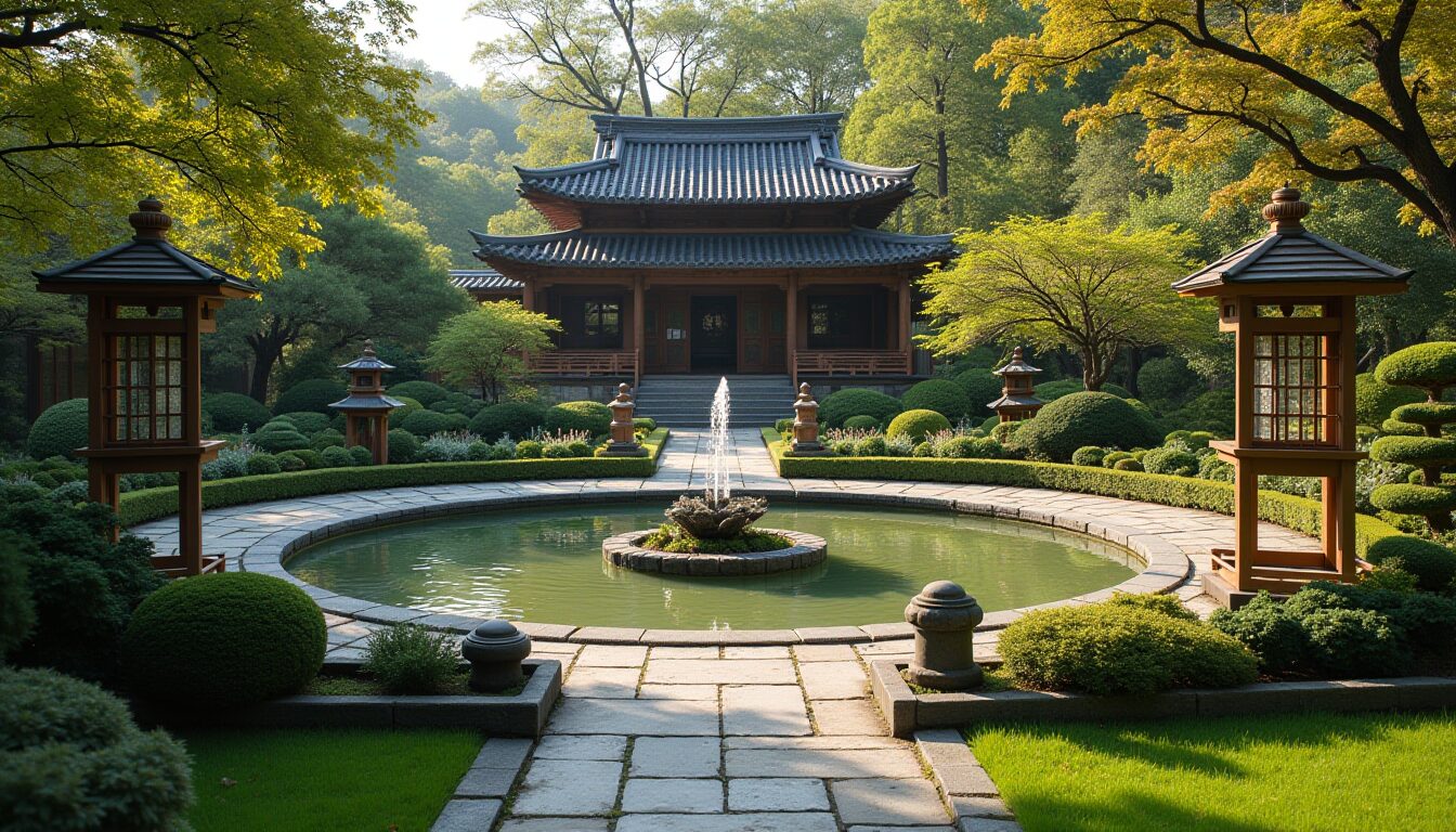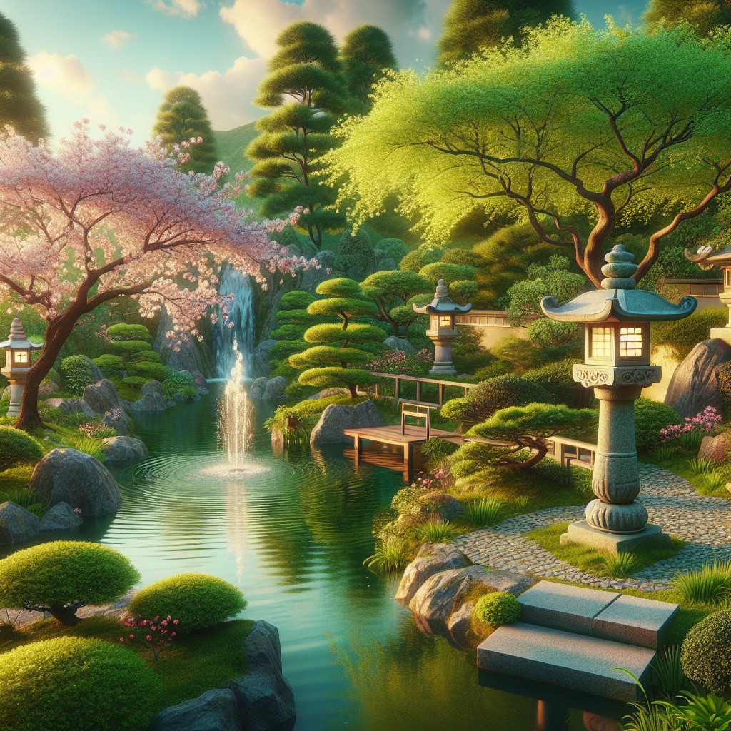 - Яркие акценты — цветущие деревья и растения, такие как сакура или клены, привлекают внимание и подчеркивают красоту.