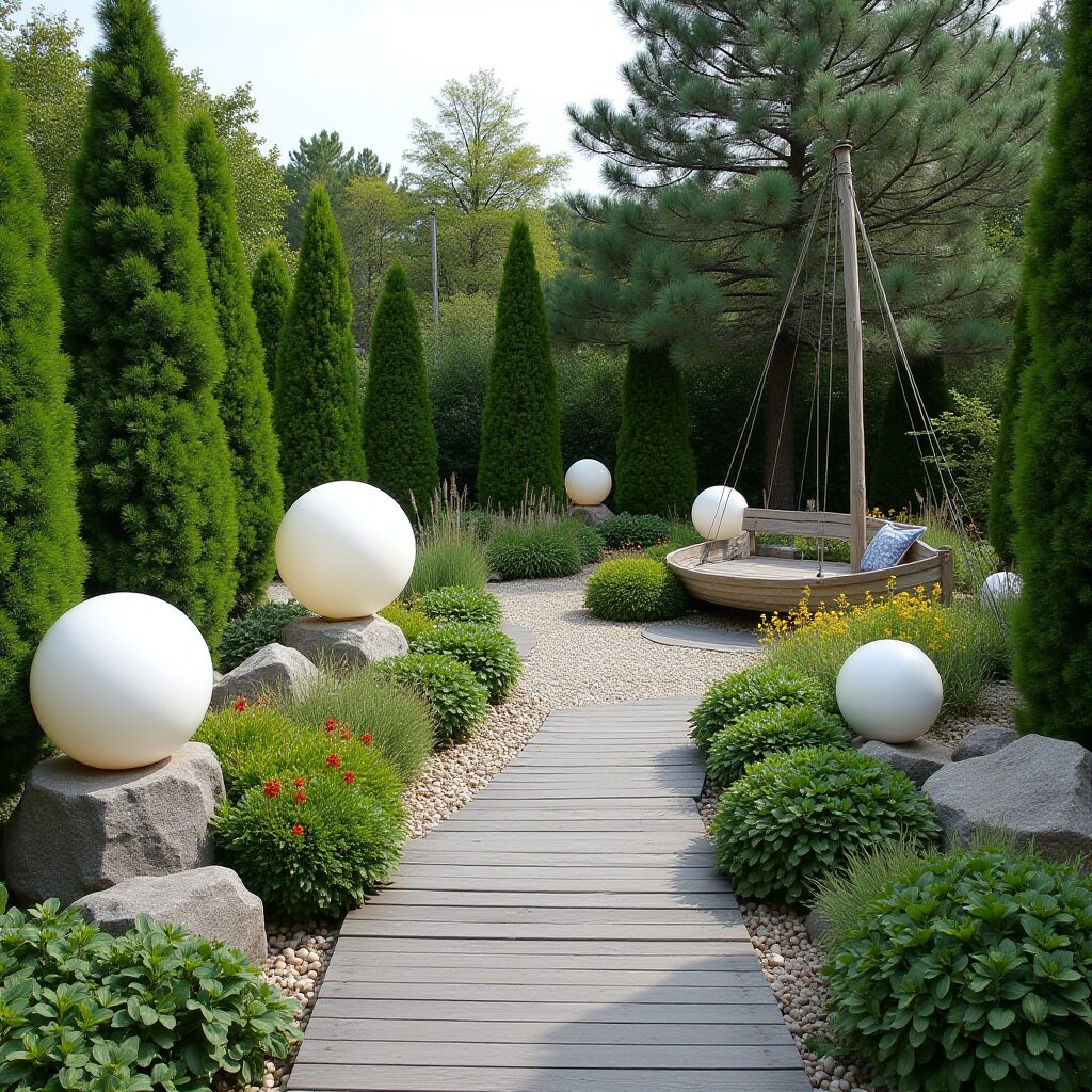 Прекрасно взаимодействует с деревянными элементами, часто присутствующими в скандинавском ландшафтном дизайне, создавая баланс между природными материалами и придавая пространству уютную атмосферу. Камень не просто декор, а важный элемент, способствующий созданию функционального и эстетически привлекательного пространства, которое гармонично вписывается в окружающий пейзаж. Такие элементы, как живые изгороди из туи, ели и можжевельника, а также большие валуны — становятся важными акцентами, создающими уютное место для отдыха, где свет и вода гармония используются для создания максимального комфорта. В дизайне в скандинавском стиле, сосна играет важную роль, идеально сочетаясь на участке с огородом, что создает гармоничное пространство, где простота и функциональность дополняют природную красоту. При этом обязательно применяются бордюры из злаков и трав, а также грядки, что позволяет расширить пространство дачи, соблюдая принципы, основанные на простоте и функциональности.