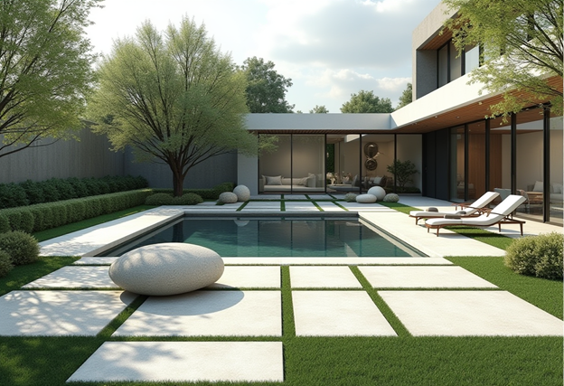 - Геометрические формы. Четкие линии и лаконичные очертания, прямоугольники и квадраты, создают структуру и порядок. Дорожки и мощение играют важную роль в минималистичном дизайне, они обычно строго прямые, с четко выстроенной геометрией. Часто используются бетонные плиты или галька, которые создают четкие геометрические формы и добавляют территории ощущение простоты. Также популярны клумб в виде прямоугольников, благодаря которым создается гармоничное зонирование территории.