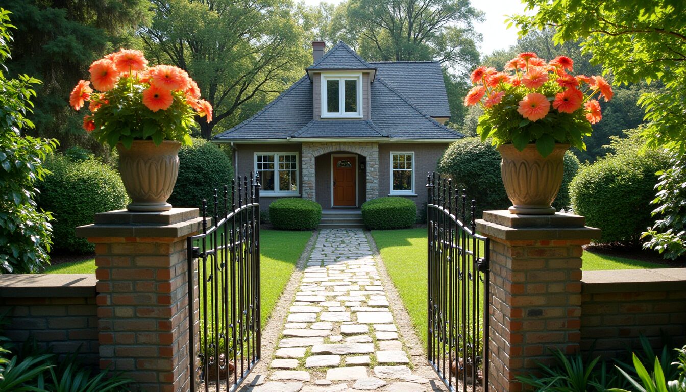 - Если ворота находятся напротив двери дома, прямо по центру, то рядом с ними можно поставить справа и слева крупные вазоны с цветами.