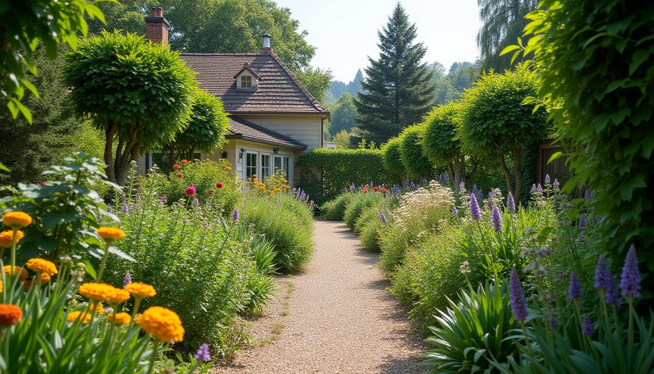 - Кантри (деревенский) — мелисса, кусты смородины и крыжовника, пионы, хризантемы, другие пышноцветущие цветы.